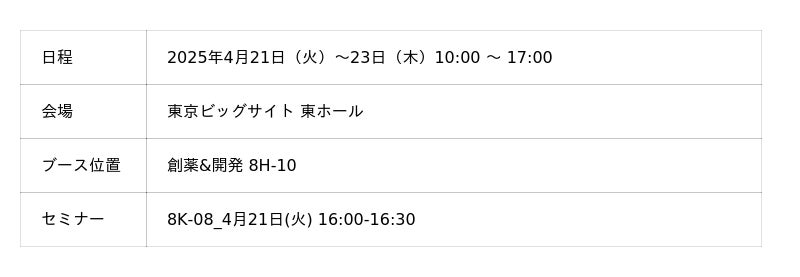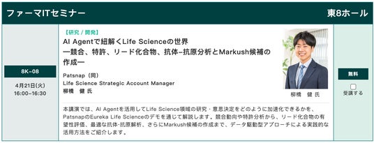 また、4月21日(火)16:00~16:30の講演では、AIエージェントの活用によるライフサイエンス領域における研究および意思決定の高度化・迅速化について解説いたします。競合動向・特許分析を起点に、リード化合物の有望性評価、抗体‐抗原解析、さらにはMarkush候補の設計に至るまで、一連の実践的な活用アプローチをご紹介いたします。