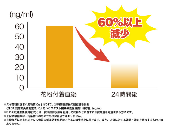 下図はハウスダスト因子除去性評価をELISA法(酵素免疫測定法)で行った結果を示したものです。時間が経つにつれて、アレル物質(Cry j 1)のはたらきが大きく低減していることがわかります。