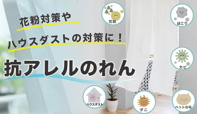 「抗アレルのれん」は花粉やハウスダストをキャッチするだけでなく、アレル物質のはたらきそのものを低減させる効果もあり、室内の花粉・ハウスダスト対策に効果的です。