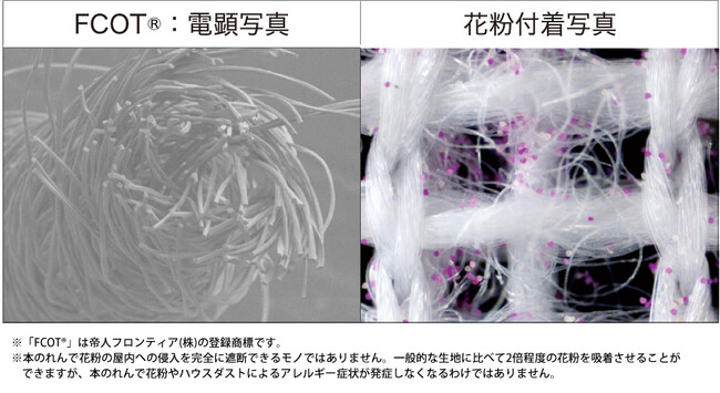 「抗アレルのれん」の素材“FCOT(R)”にはクリンプと呼ばれる縮れ加工があり、生地の表面に触れた花粉やホコリ等のハウスダストをしっかり捉えます。検証により、一般的なポリエステル素材に比べて約2倍以上のキャッチ率(※帝人調べ)が確認されています。
