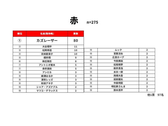 赤の1位は80票でカズレーザーさんでした。常に赤い服を身に着けており、トレードマークとして広く認識されているようです。2位は大谷翔平選手、3位は同率で松岡修造さんとももいろクローバーZの百田夏菜子さんでした。