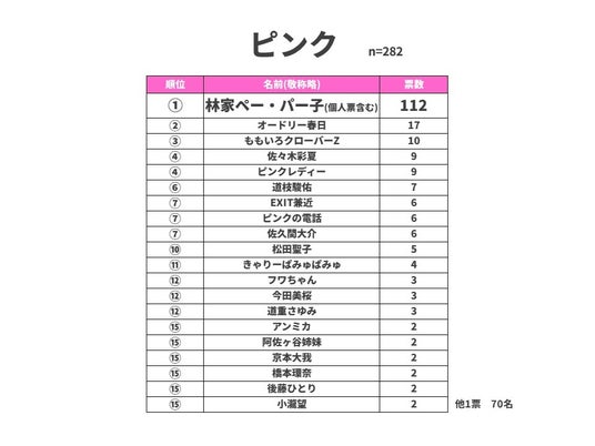ピンクの1位は林家ペー・パー子夫妻でした。獲得票数は112票で6色の中で最も高い結果となりました。個人票でも上位にランクインしており、ピンクのイメージが非常に強いことがうかがえます。2位は17票でオードリー春日さん、3位は10票でももいろクローバーZでした。