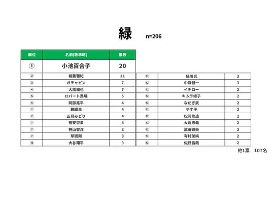 緑の1位は20票で東京都知事の小池百合子さんでした。次に嵐の相葉雅紀さんが11票で2位、ガチャピンが7票で3位という結果となりました。嵐のメンバーは今回アンケートを行った中に該当する色があったメンバーは全員ランクインしていました。