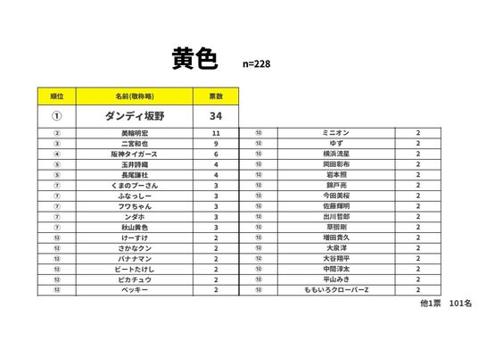 黄色の1位は「ゲッツ!」でおなじみのダンディ坂野さんでした。いつも着ている黄色のスーツがトレードマークとなっているようです。2位は11票で美輪明宏さん、3位は9票で嵐の二宮和也さんでした。