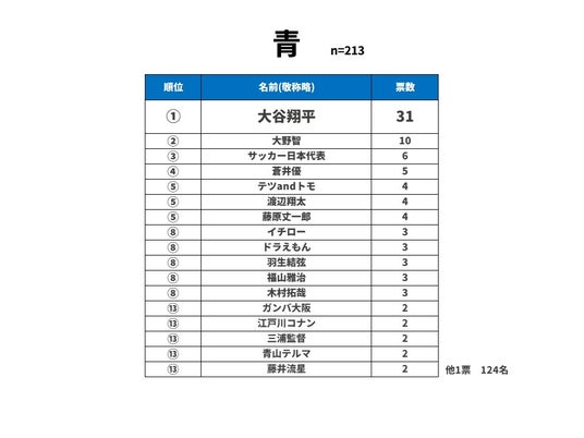 青の1位は大谷翔平選手でした。現在所属しているロサンゼルス・ドジャースのユニフォームカラーで青のイメージが強いのではないかと考えられます。2位は嵐の大野智さん、3位はサッカー日本代表でした。