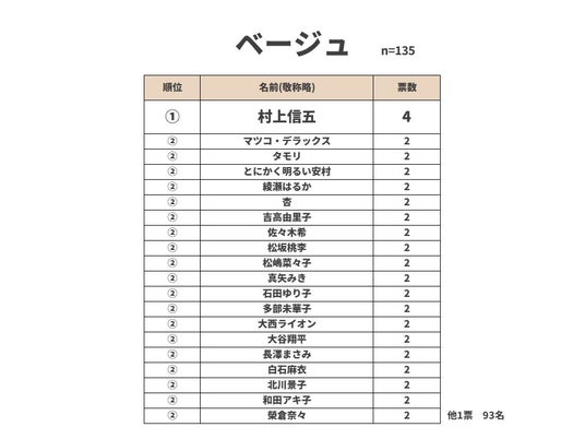 ベージュの1位は4票でSUPER EIGHTの村上信五さんでした。ベージュは他の5色と比べてまとまった票が少なく、あまり色と人が結びついていないようです。2位には同率で、マツコ・デラックスさんやタモリさんなど19名が入っていました。