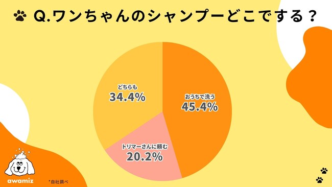 実際に飼い主のみなさんがどこで愛犬のシャンプーを行っているか調査したところ、45.4%の飼い主さんが「自宅」でワンちゃんのシャンプーをしていることがわかりました。