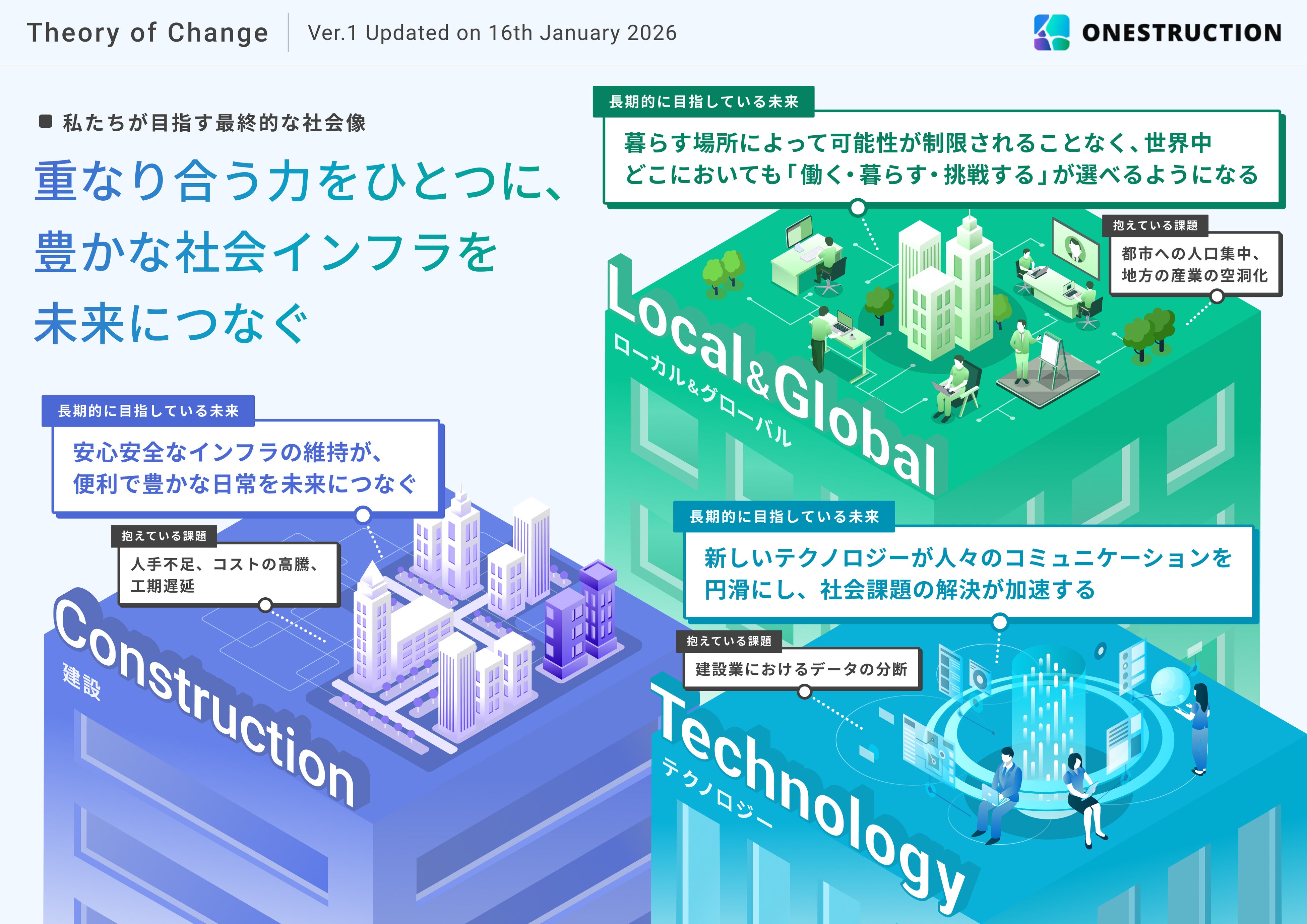 今回策定したセオリー・オブ・チェンジは、建設、テクノロジー、ローカル&グローバルの3つのテーマで、2枚構成で作成しました。