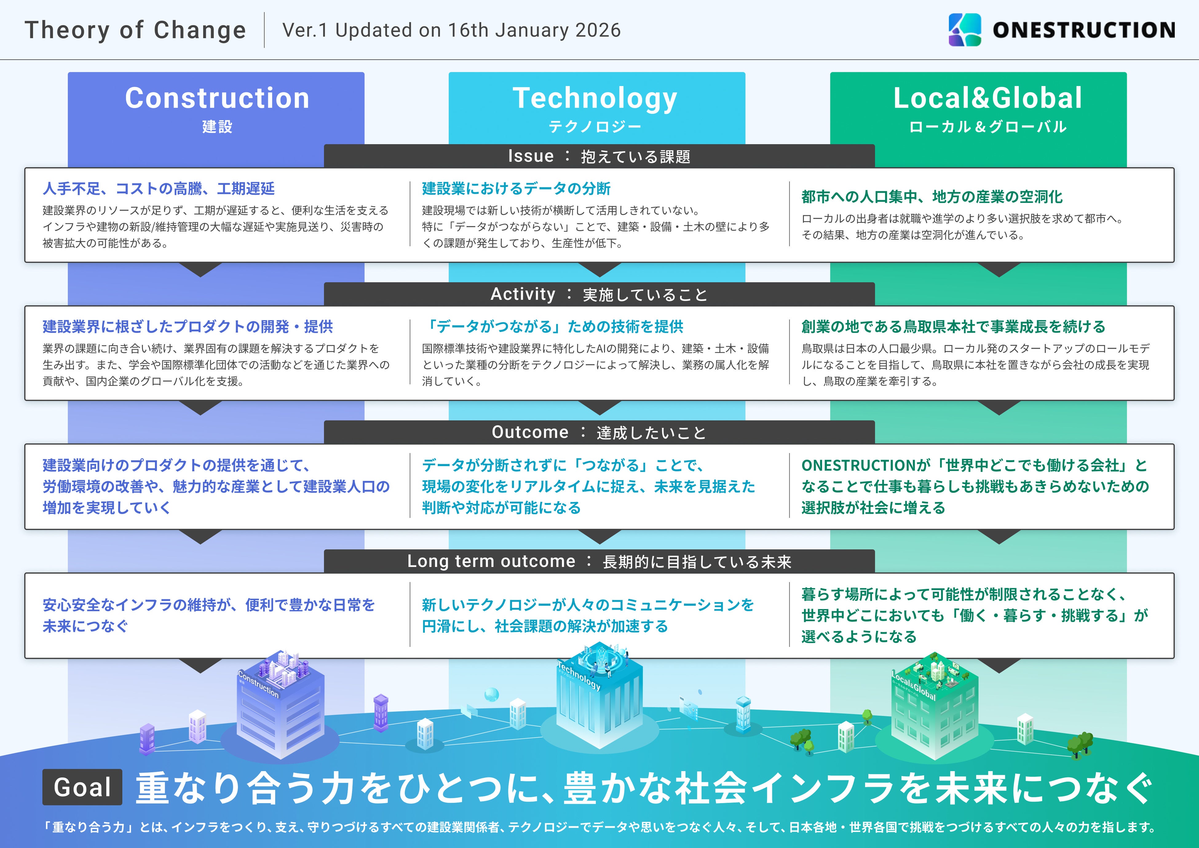 「建設とテクノロジーの架け橋に」をミッションに、openBIMを中心とした建設分野のソリューションを開発するONESTRUCTION株式会社(本社:鳥取県鳥取市、代表取締役:西岡大穂)は、社会インパクトの測定および可視化に向けた第一歩として、実施方針を示した「セオリー・オブ・チェンジ(Theory of Change)」を策定しました。