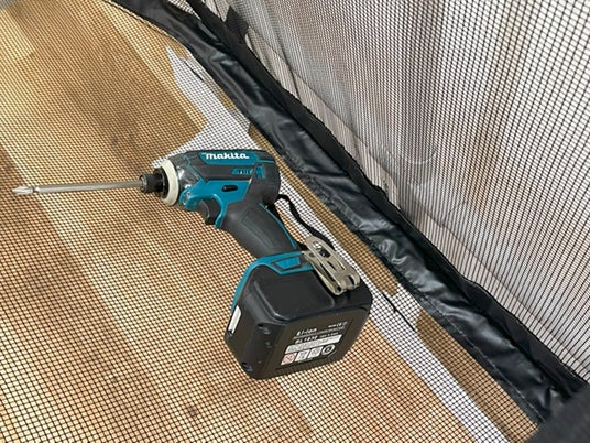 ネットには建築現場でも利用される養生用ネットと同素材を採用。重さ約2kgの電動ドリルもしっかり受け止めます。
