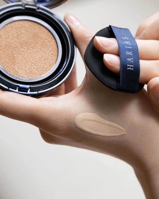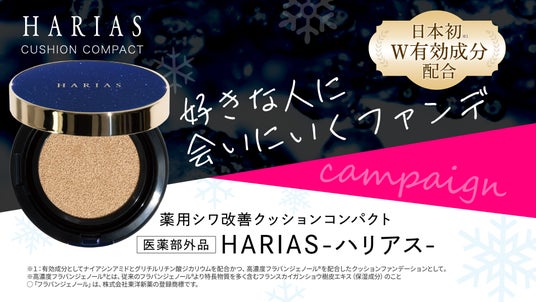 ハリアスは日本初(※1)のW有効成分が配合されたメイクしながらスキンケアのできる薬用クッションファンデーション。独自成分「高濃度フラバンジェノール(R)」(※2)配合で、驚きの保湿力で透明感(※3)とハリのある美肌へと導きます。