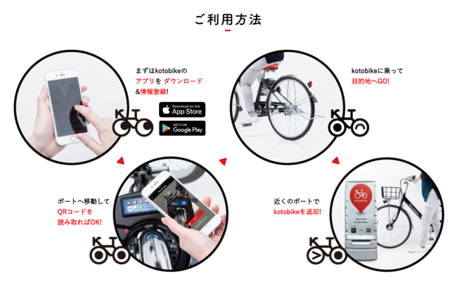 kotobikeアプリをダウンロードし、会員登録をしていただいたのちに、車体に貼付されている二次元バーコードを読み取っていただくことで利用を開始できます。貸出ポートとは異なるポートに返却することも可能です。