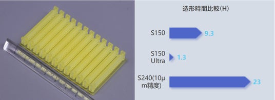 特にS150 Ultraは、S150と比較して最大約9倍、S240(10μm精度)と比較して最大約20倍の造形速度を実現し、生産性の大幅な向上に貢献します。