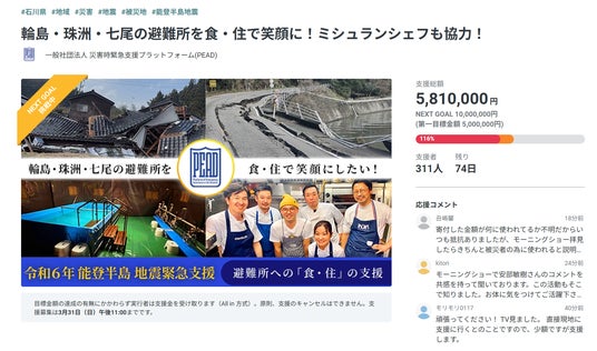 一般社団法人 災害時緊急支援プラットフォーム(所在地:東京都渋谷区、代表理事:吉田浩一郎 株式会社クラウドワークス 代表取締役社長CEO、以下「本団体」)は、避難所対策や地域医療、ライフライン関連の被災地支援のため、クラウドファンディング「輪島・珠洲・七尾の避難所を食・住で笑顔に!ミシュランシェフも協力!」を1月12日開始し、開始4日で第一目標の500万円を達成しました。