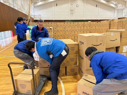 株式会社良品計画より提供いただいた食料4,000セット、水160ケース、携帯トイレ1,000個などの生活用品の提供。※先んじて現地避難所へ運搬済み。
