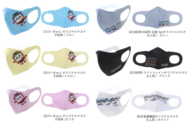 ラインナップは 子ども用「けいきゅん オリジナルマスク」ブルー・イエロー・ピンク大人用【1000形600形正面バージョン グレー】 【1000形ライントレイン ブラック】 【京急路線図 ホワイト】