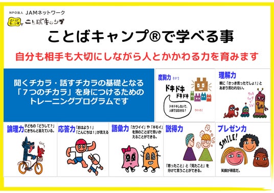 2003年に設立。自分を大切にし、相手も尊重しながら良好な人間関係を構築できるコミュニケーション力の育成が、子どもたちの未来を支える重要な要素だと考え、ことばの7つの力(度胸力・論理力・理解力・応答力・語彙力・説得力・プレゼン力)を育成する独自開発のトレーニングプログラム「ことばキャンプ(R)」を通じたコミュニケーション力育成活動を児童養護施設で実施しています。これまでのべ160施設・1100人の子ども・3600人の職員にことばキャンプを届けてきました。全国約600か所の児童養護施設すべてで「ことばキャンプ(R)」メソッドが養育に活用されるようになることを目指して活動しています。