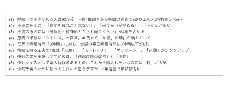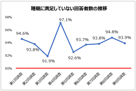 全国4,519名に「第9回 睡眠に関する調査」を実施、「睡眠への不満」は93.9%、主な不満は「寝ても疲れが取れない」~快眠のためにストレッチ、マッサージ、運動をする人が増加~