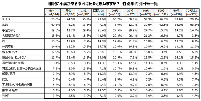性別間での特長は、女性のほうが「ストレス」だと回答する人がより多く、「手足の冷え」に悩む人も多くなっています。一方、男性は「ストレス」もしくは「加齢」に回答が集中しています。年代別では、「育児の疲れ、就寝中の子どもの世話」が30代に多く、年を重ねるほどに「加齢」が原因となる傾向にあります。