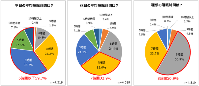 回答者全員に平日の平均睡眠時間を聞いたところ、最も回答数が多かったのは「6時間」(36.7%)です。6時間以下の睡眠時間の人は約6割を占めます。休日の平均睡眠時間で最も回答が多かったのは「7時間」(32.9%)となり、平日に比べて睡眠時間を確保できていることがわかります。一方、理想の睡眠時間は「8時間」(50.9%)が最も多い回答でした。実際に、平日に8時間以上の睡眠を取れている人は12.1%、休日で31.7%ですので、睡眠時間を長く確保することが難しく忙しい生活を送っている人が多いことがうかがえます。