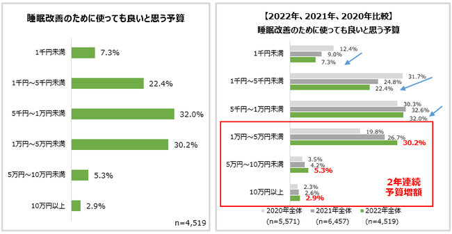 「睡眠改善のために使っても良いと思う予算」を聞いたところ、回答の多かった順に「5千円~1万円未満」(32.0%)、「1万円~5万円未満」(30.2%)、「1千円~5千円未満」(22.4%)という結果でした。前回(2021年発表)、前々回(2020年発表)の調査結果と比較すると、1万円以上の予算を回答する人の割合が増えており、睡眠への投資金額が2年連続で増額していました。