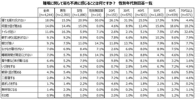 特に男性の回答では「トイレが近い」が多く、女性の回答では「寝ても疲れがとれない」や「眠りが浅い」の回答が多くありました。年代別では20~30代では「睡眠時間が満足にとれない」という悩みがあり、40代から年代が上がるごとに「何度か目が覚める」の回答割合が増えています。