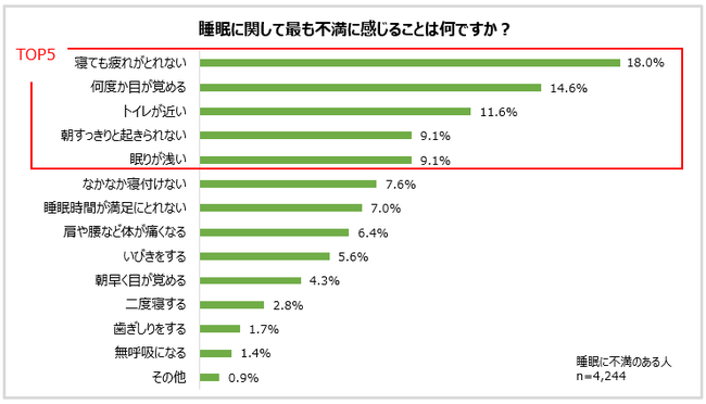 「睡眠に関して最も不満に感じることは何ですか?」を聞いたところ、回答の多かった順から「寝ても疲れがとれない」(18.0%)、「何度か目が覚める」(14.6%)、「トイレが近い」(11.6%)、「朝すっきりと起きられない」(9.1%)、「眠りが浅い」(9.1%)という結果になりました。TOP5は昨年と同じ結果でした。