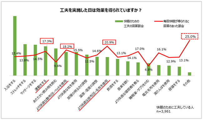 「快眠の工夫を実施した日は効果を得られていますか?」の問に対し、快眠効果が得やすいものは「より快適な掛布団・毛布を使用」(20.9%)、「より快適な敷布団・ベッドを使用」(18.2%)、「運動をする」(17.3%)でした。寝具をより快適なものにアップデートすることが快眠につながりやすいと実感している人が多く、また、体を動かした疲労感からよりよい睡眠に繋げられている人も多いようです。快眠の工夫を「その他」と回答した人のうち25%が快眠を得られているという結果については、それぞれに自分自身の快眠に適した工夫を行っているのではないかと推察します。