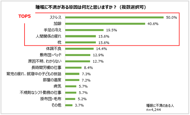 「睡眠に不満がある原因は何だと思いますか?(複数選択可)」の質問では、「ストレス」(50.0%)、「加齢」(40.6%)、「手足の冷え」(19.5%)、「人間関係の疲れ」(15.6%)、「枕」(15.6%)でした。昨年に続き「ストレス」が半数を超える結果になっています。
