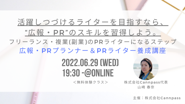 株式会社Cannpass(所在地:東京都渋谷区、代表取締役:山崎春奈)は、2022年6月29日(水)19時半より、「広報・PRプランナー&PRライター養成講座」体験クラスを開催いたします。