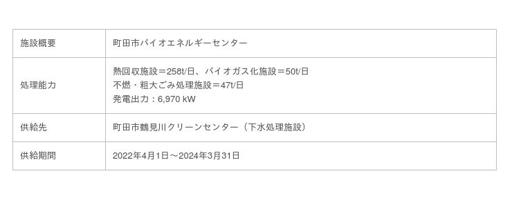 2022年4月からの電力供給にあたっては、バイオECの電力を中心に供給する町田市向け独自の電力供給メニュー「町田市電力地産地消メニュー」により電力の地産地消を推進するとともに、温室効果ガス排出量と電気料金の削減に貢献します。