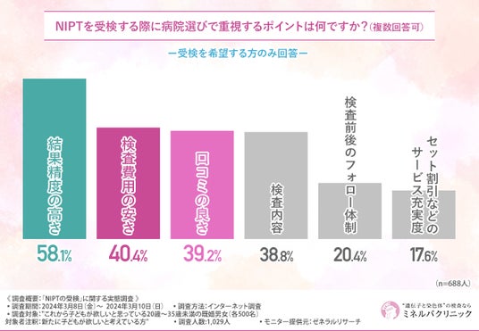 「NIPTを受検する際に病院選びで重視するポイントは何ですか?(複数回答可)」と質問したところ、『結果精度の高さ(58.1%)』と回答した方が最も多く、次いで『検査費用の安さ(40.4%)』『口コミの良さ(39.2%)』と続きました。
