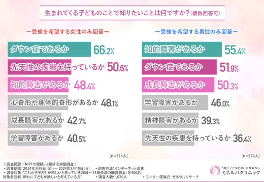 まず、女性の方に「生まれてくる子どものことで知りたいことは何ですか?(複数回答可)」と質問したところ、『ダウン症であるか(66.2%)』と質問したところ、次いで『先天性の疾患を持っているか(50.6%)』『知的障害があるか(48.4%)』と続きました。続いて、男性の方に「生まれてくる子どものことで知りたいことは何ですか?(複数回答可)」と質問したところ、『知的障害があるか(55.4%)』と回答した方が最も多く、次いで『ダウン症であるか(51.9%)』『成長障害があるか(50.3%)』と続きました。
