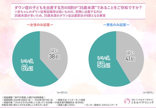 そのため、男女双方受検したほうがより正確であると言えます。さらに、男女ともに約6割の方が、「ダウン症の子どもを出産する方の8割が“35歳未満”であることを“知らない”という結果も示されました。