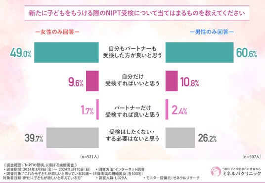 女性の方に「新たに子どもをもうける際のNIPT受検について当てはまるものを教えてください」と質問したところ、『自分もパートナーも受検した方が良いと思う(49.0%)』と回答した方が最も多く、次いで『自分だけ受検すればいいと思う(9.6%)』『パートナーだけ受検すれば良いと思う(1.7%)』『受検はしたくない・する必要はないと思う(39.7%)』という回答結果になりました。続いて、男性の方に「新たに子どもをもうける際のNIPT受検について当てはまるものを教えてください」と質問したところ、『自分もパートナーも受検した方が良いと思う(60.6%)』と回答した方が最も多く、次いで『自分だけ受検すればいいと思う(10.8%)』『パートナーだけ受検すればいいと思う(2.4%)』『受検はしたくない・する必要はないと思う(26.2%)』という回答結果になりました。男女双方、NIPT受検を支持している方が最も多い結果となりました。また、男性の方が女性と比べ受検希望者が多いことが分かりました。