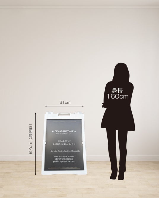 大型で高い視認性を持ちながら、設置しやすく屋外でも安定して使えるA型スタンド看板【DEKABAN】。店舗前や駐車場・イベント会場など、屋外での案内や告知を手軽に行いたいシーンでぴったりの1台です。