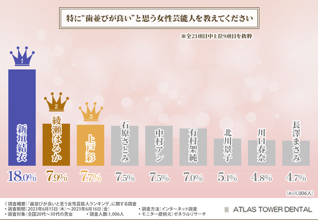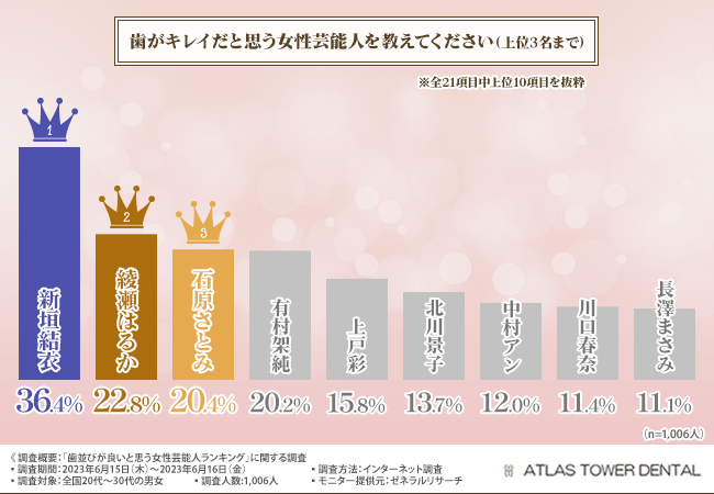 そこで今回、医療法人社団山手会アトラスタワーデンタルクリニック(https://8wa.jp)は、全国の20代~30代の男女を対象に、「歯並びが良いと思う女性芸能人ランキング」に関する調査を実施しました。