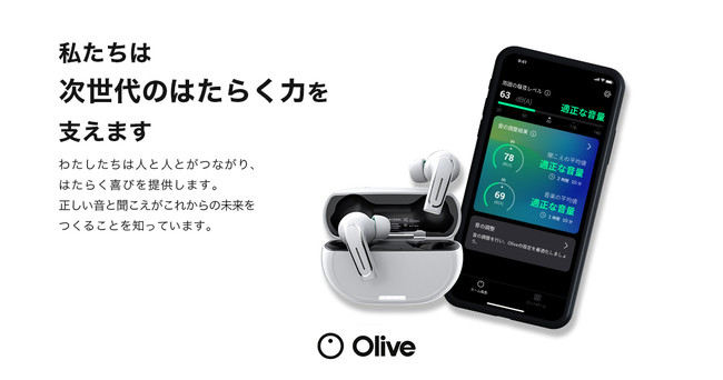 オリーブユニオンは、スマートフォンアプリで「音の最適化」ができるイヤホンとサブスクリプションサービスを提供しています。補聴器や集音器とも異なるコンセプトで、すべての人に聞きたい音を届ける『HaaS(Hearing as a Service)』プラットフォームの構築を行っています。社名及び製品名のOliveは、オリーブの枝が「平和の象徴」を意味することに由来し、誰しもが聞こえをはじめとした健康不安にならない世界を目指し、デジタル技術ですべての人のライフスタイルに合わせた製品、サービスを提供していきたいという想いが込められています。