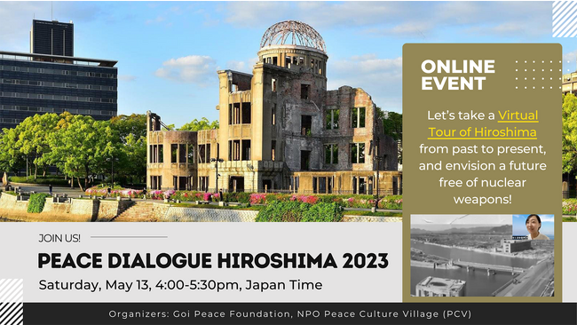 G7広島サミットに合わせ、5月13日(土)に、平和の担い手を育む教育プログラムを展開する公益財団法人五井平和財団と広島で若者主導の平和教育を推進するNPO法人Peace Culture Village(PCV)は、「ピース・ダイアログ・ヒロシマ 2023」をオンラインで開催しました。