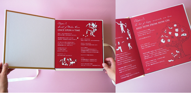 創業10周年の記念品として制作したギフトブックは、箱からすべてオリジナルで企画しました。メリアルームの企業理念「私たちは、愛・幸せ・感動が生まれる時を創ります」を大切なパートナーの皆さまや従業員へお届けできるよう、3つのサプライズなギフトを詰め込みました。