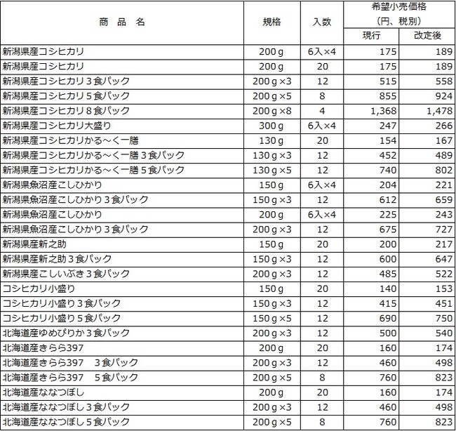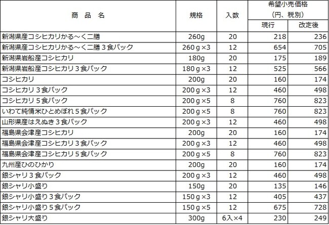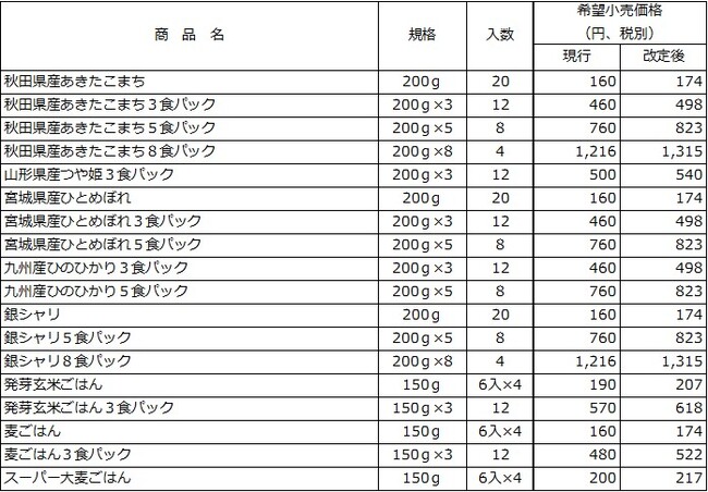 しかしながら、昨今のエネルギー費・資材価格の急激な高騰および物流費・人件費等の上昇について、このまま自社の企業努力だけで吸収し続けることは極めて困難であるとの判断に至り、お客様に引き続き高品質で安心・安全な当社パックごはんをお届けしていくため、やむを得ず、下記の通り商品価格の改定を行うことといたしました。