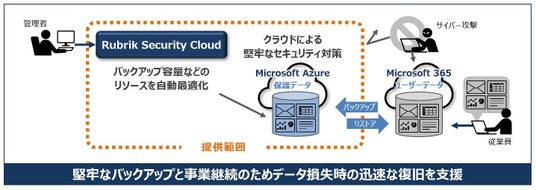 本ソリューションでは、Microsoft Azureのストレージサービスを活用したRubrik, Inc.(本社:米国カリフォルニア州パロアルト 以下、Rubrik)のRubrik Security Cloud製品によりMicrosoft 365の不慮のデータ損失に対し復旧を可能とします。