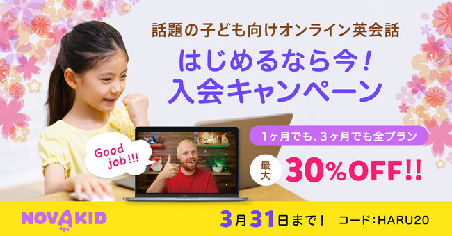 子ども向けオンライン英会話サービスを提供するEdTech企業、Novakid(本社、米国サンフランシスコ、以下、ノバキッド)は、3月25日(金)から3月31日(木)までの7日間、新規入会の方に限りノバキッドが提供する全プランを20~30%OFFでご利用いただける「春の入会キャンペーン」を初開催します。