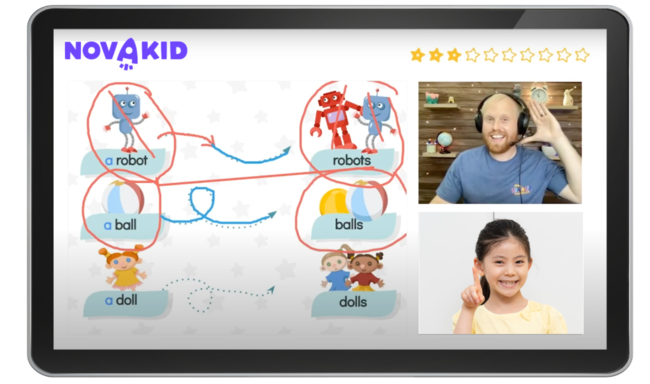 専用のWebプラットフォームを通じて、お絵かき、歌、ゲームなどのオリジナル教材を使い、楽しみながら英語に慣れ親しんでいきます。子どもと先生の双方が直接デジタル画面に書き込めることも、子どもたちの集中力が途切れず、レッスンを最後まで受講できるポイントです。生徒毎に用意されたアカウントでは、レッスンや宿題の達成度合いに応じて、ノバキッド上のゲームで使用できる「スター」が与えられ、子どもたちのやる気を促進させる工夫も施されています。