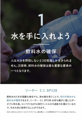 飲料水の入手が困難な場合でも、浄水器を使うことで、河川や雨水から飲み水が確保できます。ソーヤー ミニ SP128 は持ち運びに適したポータブル浄水器。コンパクトながら38万リットルのろ過能力を備えているので、半永久的に使用することができます。
