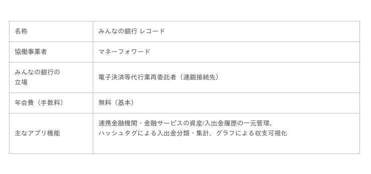 株式会社みんなの銀行(取締役頭取 横田 浩二、以下「みんなの銀行」)は、株式会社マネーフォワード(代表取締役社長CEO 辻庸介、以下「マネーフォワード」)と協働し、2021年5月下旬に予定しているみんなの銀行のサービス提供開始に合わせて、みんなの銀行スマートフォンアプリ(以下「本アプリ」)で、他の金融機関口座・クレジットカード・電子マネーの資産/入出金履歴を一元的に管理できる「レコード機能」を提供します。銀行アプリ内において、ハッシュタグやグラフといったユニークなデザインでお金の管理を実現するのは国内銀行初の取組みです。