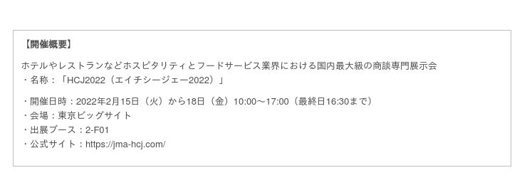 テクトレ株式会社(本社:神奈川県横浜市、代表取締役:肖 書芳)は、2022年2月15日(火)から18日(金)に開催されるホテルやレストランなどホスピタリティとフードサービス業界における国内最大級の展示会「HCJ2022(エイチシージェー2022)」に初出展いたします。