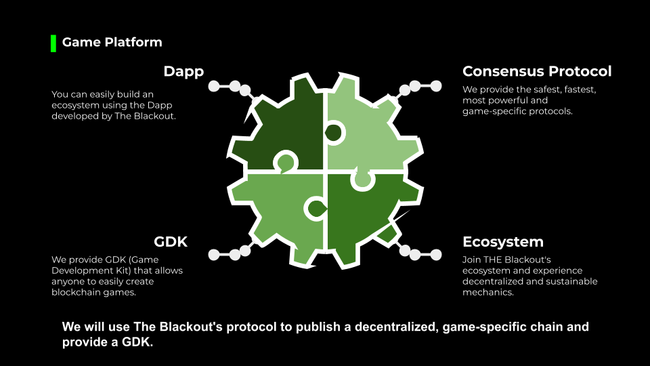 オープンで分散的に開発されたコンセンサスプロトコルを利用してブロックチェーンゲームの普及を目指します。誰でも簡単にブロックチェーンゲームの導入ができるGDK(Game Development Kit)の開発・提供を行います。