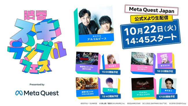 この秋冬にVR化されMeta Questに登場する人気のコンテンツ4作品にフォーカスをあて、1Dayのトークイベント「渋谷スキランブルフェス」を10月22日(火)に開催し、Meta Quest JapanのX公式アカウント(@MetaQuestJapan https://x.com/MetaQuestJapan?ref_src=twsrc^google|twcamp^serp|twgr^author )より生配信します。