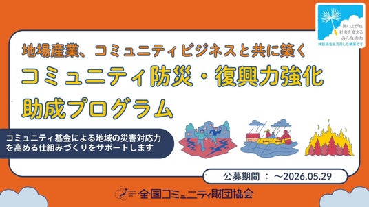 一般社団法人全国コミュニティ財団協会 (所在地:京都府京都市、会長:高橋潤)は、休眠預金等活用法に基づく資金分配団体として、「地場産業、コミュニティビジネスと共に築くコミュニティ防災・復興力強化助成プログラム」の公募を2026年4月10日(金)より開始しましたのでお知らせいたします。本事業では、1団体あたり約3年間で最大2,500万円の資金支援を行い、災害基金の設立・運営を通じて、平時から地域の防災力を高め、持続可能な地域づくりに貢献することを目指します。